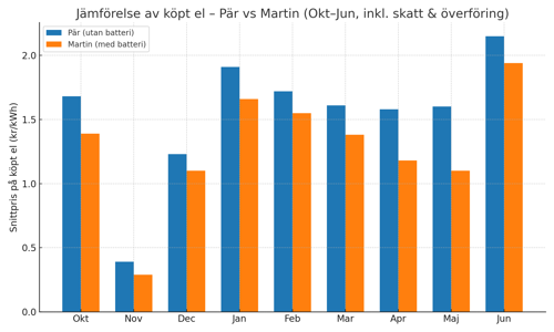 • Martins genomsnittliga Elpris Oktober 2024-Juni 2025:1,39 kr/kWh inkl påslag, elöverföringsavgift och energiskatt